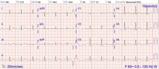 60-year-old male with history of hypertension and hyperlipidemia was referred to our outpatient clinic by his primary care provider for abnormal Electrocardiogram (ECG) with Premature Ventricular Complexes (PVCs) and shortness of breath on exertion. Shortness of breath occurred with minimal exertion and was not associated with chest pain or discomfort. He did admit to a history of tobacco use and was on an inhaled Short Acting Beta Agonist (SABA) rescue inhaler. The patient’s symptoms persisted, and he became worse despite treatment with a SABA rescue inhaler. He denied any family history of premature coronary disease and was compliant with other cardiac medications. During the visit, Blood Pressure (BP) was 130/80 mmHg, Heart Rate (HR) was 80 bpm, and BMI was 28.59 kg/m2. ECG demonstrated sinus rhythm with abnormal R wave progression with early transition and the presence of PVCs (Figure 1). Given his risk factors and clinical symptoms, Transthoracic Echocardiography (TTE) and a nuclear treadmill stress were ordered as outpatient tests.