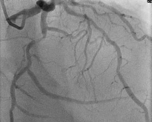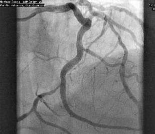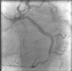 Patient was informed of these high-risk findings on CCTA with evidence of obstructive CAD and the decision was made to proceed with the gold standard left heart catheterization with coronary angiography to ensure accuracy of the obstructive lesion and intervention if the lesion was found to be obstructive. Cardiac catheterization revealed an obstructive lesion of the mid LCx with 80% calcified stenosis and he underwent successful Intravascular Ultrasound (IVUS) guided PCI of the LCx with pre and post balloon angioplasty utilizing a 3.5x22 and 3.0x15 mm overlapping Onyx frontier Drug-Eluting Stent (DES). LAD lesion angiographically appeared to be non-obstructive and medical management was elected (Figures 2-4).